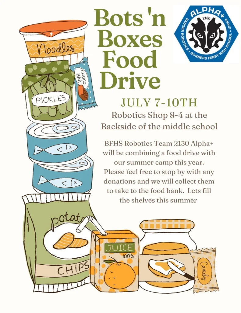 Please send up a message on our Facebook page and we can come collect non-perishable food from you or you can feel free to drop it off 8-4 Monday thru Thursday July 7 – 10 at the BOT cave on the back side of the Boundary County Middle School at 6577 Main Street in Bonners Ferry.