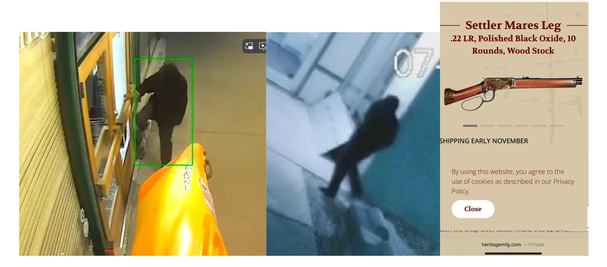 Pictures from video surveillance and a photograph of the stolen firearm below.