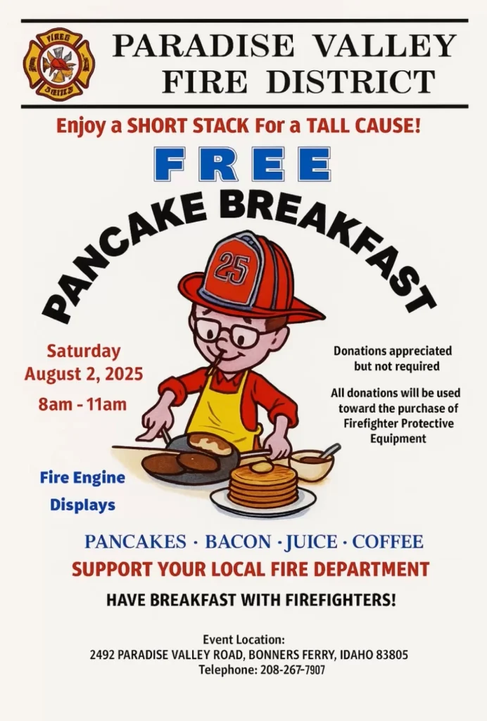 Paradise Valley’s Annual Pancake Breakfast is just around the corner.On Saturday, August 2, 2025, from 8 to 11 a.m. at Paradise Valley Fire District at 2492 Paradise Valley Road, come for a morning of pancakes, huckleberry pancakes, community and fun and meet the firefighters that proudly serve their community.