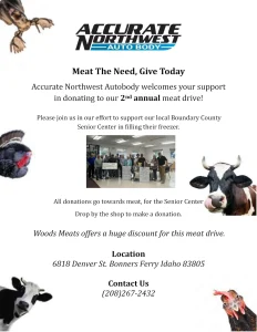 Accurate Northwest Auto Body welcomes the community’s support in donating to their second annual meat drive in efforts to support the Boundary County Senior Center.