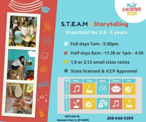 It’s not a daycare, it’s a school. S.T.E.A.M. or Science, Technology, Engineering, Art and Mathematics is the name of the game at Play Smarter Kids, located at 6913 Oak Street in Bonners Ferry. With flexible enrollment options available, Play Smarter Kids may be just what you are looking for your young children; from just a few days a week to full time; education, enrichment and early learning is key.
