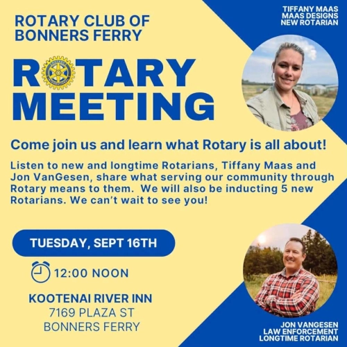 Rotary meeting, noon Tuesday, September 16, Kootenai River Inn, 7169 Plaza Street, Bonners Ferry.