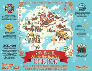 The combined efforts of the Boundary County Veterans Services Office, In His Image Group, Community Action Partnership, Rotary Club of Bonners Ferry, Boundary County School District 101, and Mountain Springs Church will share the light of Christmas. The Share the Light event is open to North Idaho community members looking for a hand-up this holiday season.