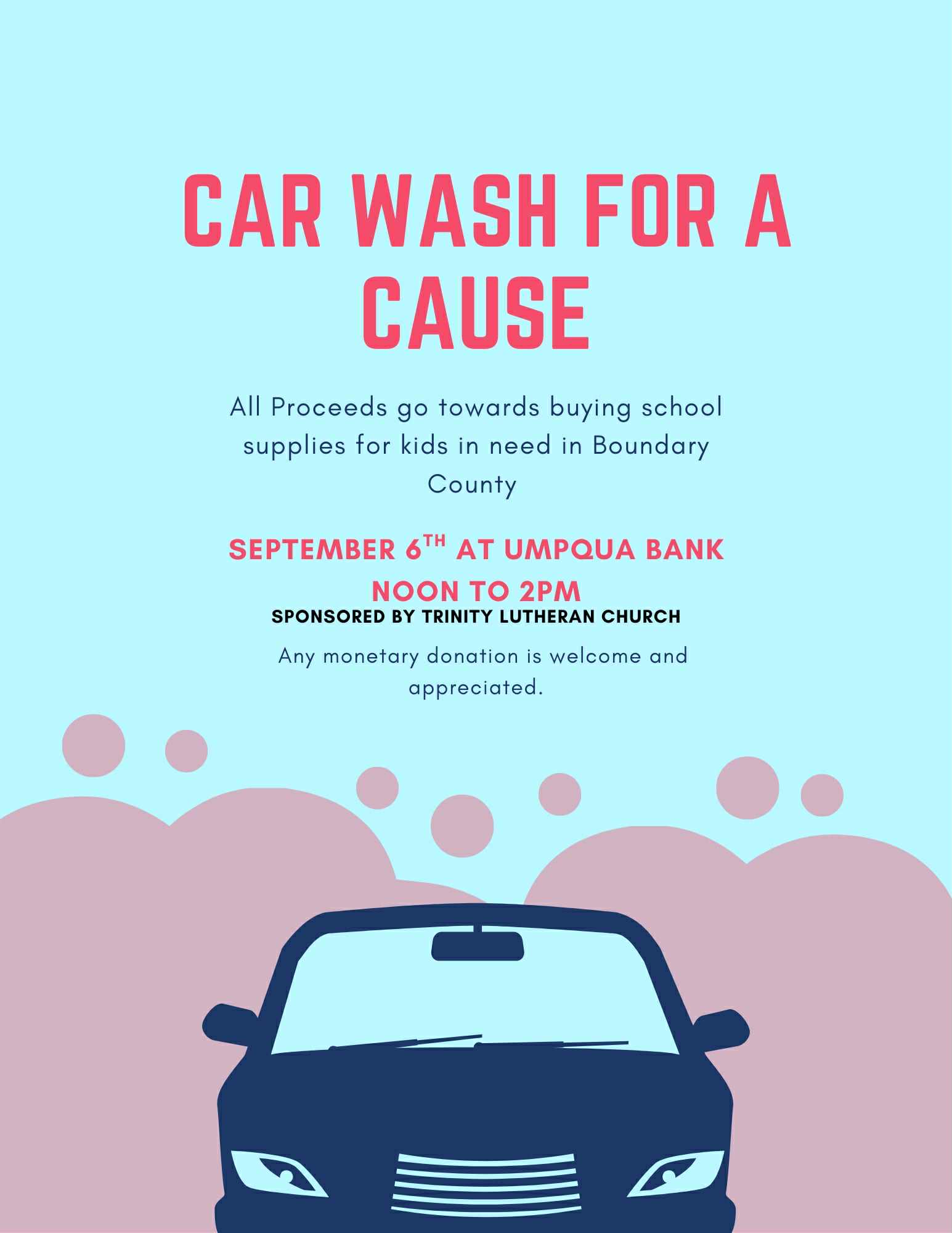 Car Wash for a Cause, noon to 2 p.m. Saturday, September 6, Umpqua Bank, 6750 Main Street, Bonners Ferry. Sponsored by Trinity Lutheran Church, all proceeds go toward buying school supplies for Boundary County kids in need. All monetary donations welcome and appreciated.