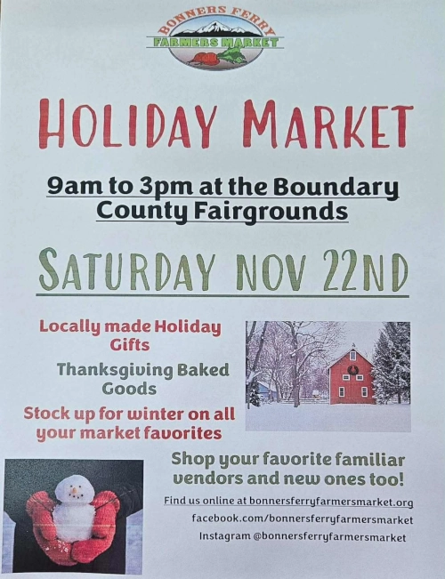 Farmers Market Holiday Market, 9 a.m. to 3 p.m. Saturday, November 22, Boundary County Fairgrounds, Bonners Ferry. Locally made holiday gifts, Thanksgiving baked goods and more!