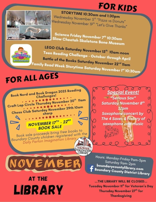 Book Sale, 9 a.m. to 5 p.m. Monday through Friday, November 17-21, Boundary County Library, 6370 Kootenai Street, Bonners Ferry.