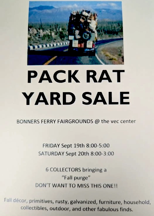 Pack Rat Yard Sale, 8 a.m. to 5 p.m. Friday, September 19, and 8 a.m. to 3 p.m. Saturday, September 20, Valley Event Center, Boundary County Fairgrounds, Bonners Ferry.