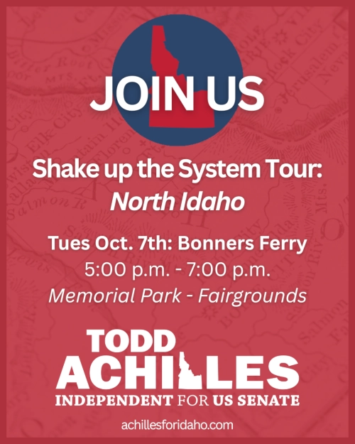 Todd Achilles Shake up the System Tour, 5 to 7 p.m. Tuesday, October 7, Boundary County Fairgrounds Memorial Park, Bonners Ferry. Todd Achilles, Independent candidate for U.S. Senate.