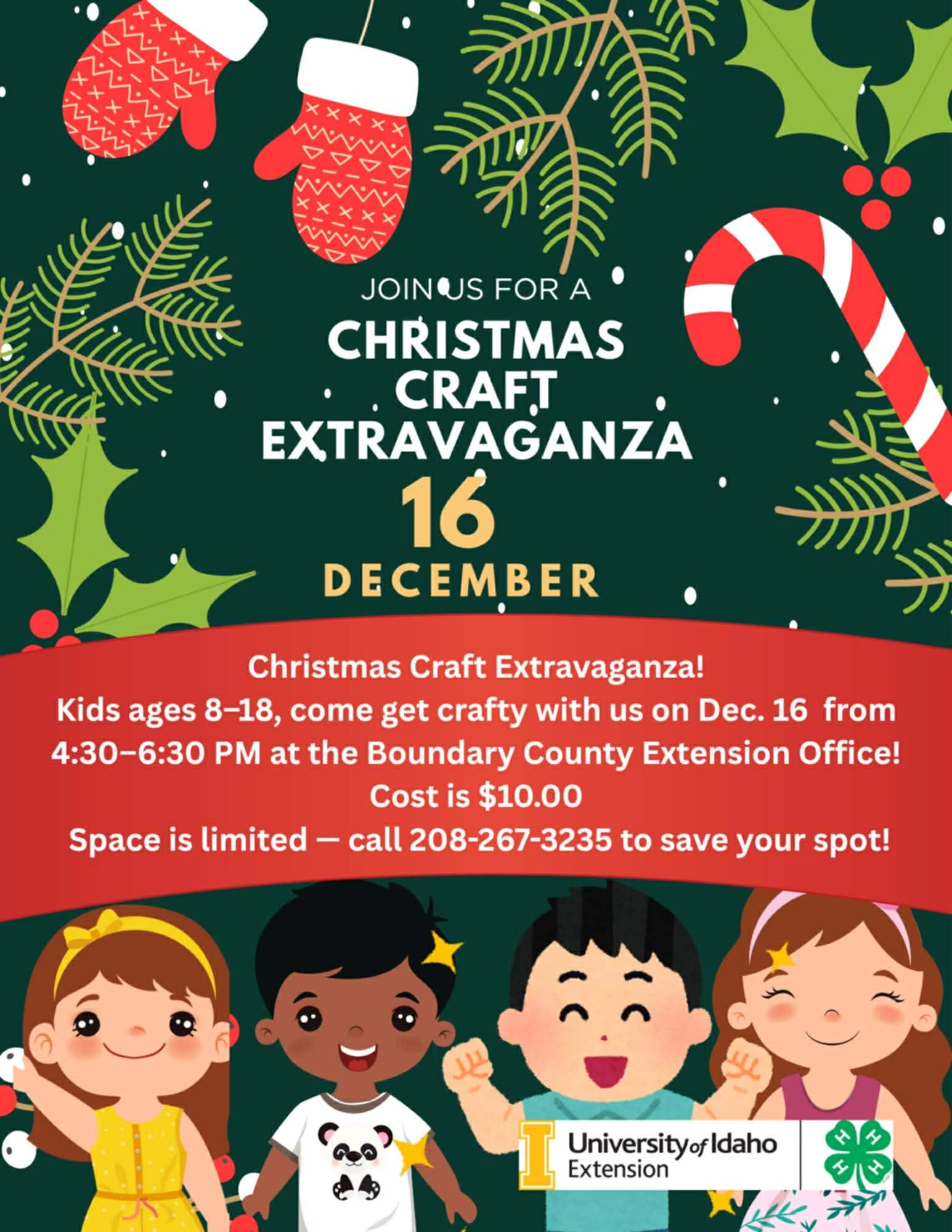 Kids ages 8 - 18 come get crafty with us on December 16 from 4:30 to 6 p.m. at the Boundary County Extension Office. Cost is $10 and space is […] |