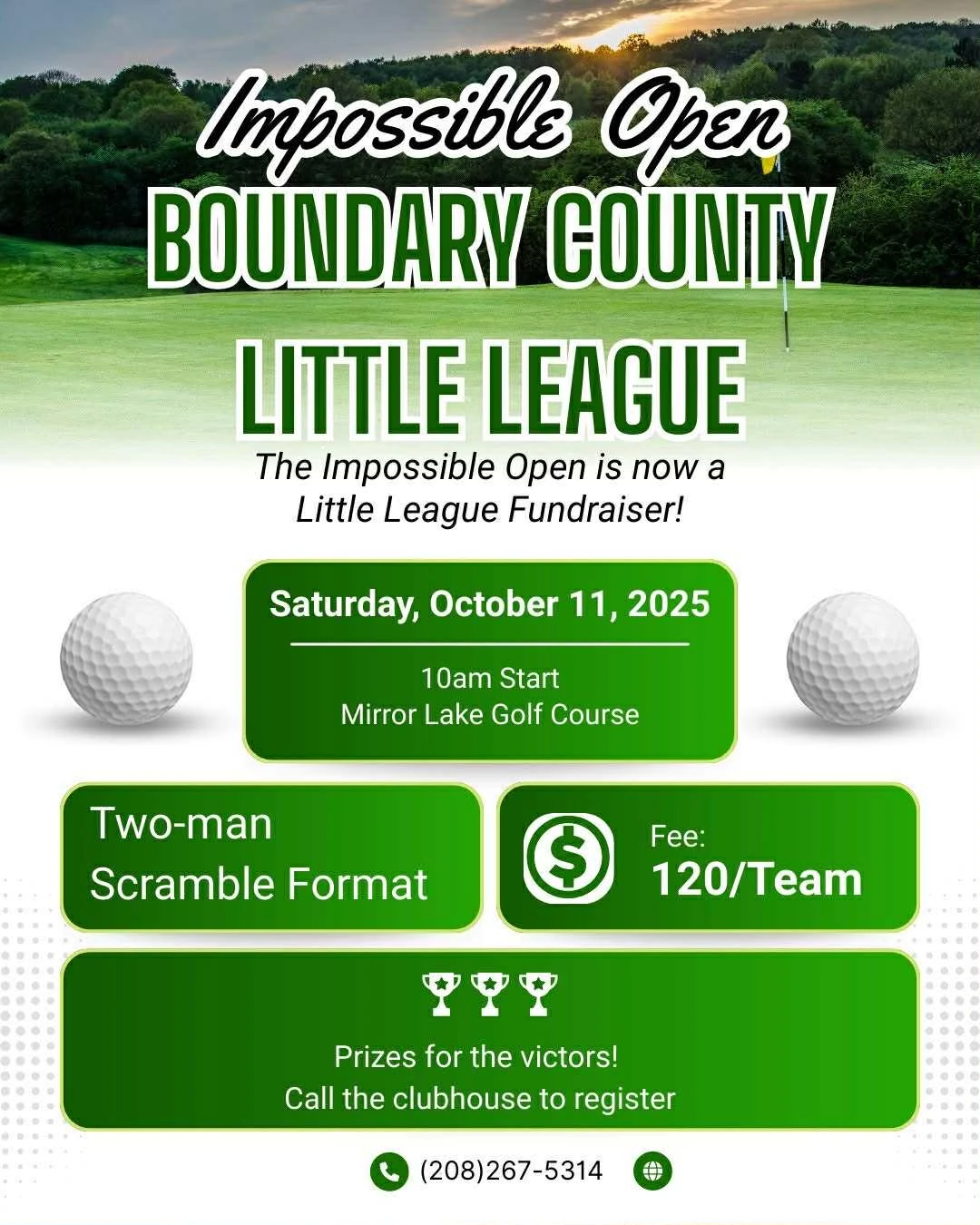 Golf Tournament to Support Boundary County Little League Oct 11 10:00 am - 5:00 pm Golf Tournament to Support Boundary County Little League