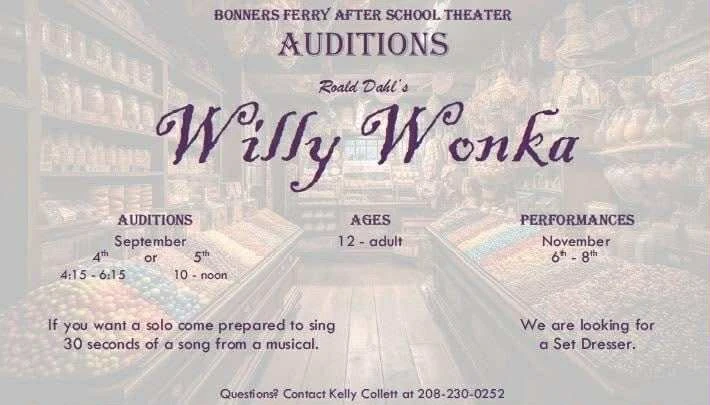 Becker Auditorium 6485 Tamarack Ln, Bonners Ferry, ID, United StatesBonners Ferry After School Theater Auditions, Willy Wonka, 10 a.m. to noon Friday, September 5, Becker Auditorium at Bonners Ferry High School. Ages 12 to adult. Performances November 6 to […]