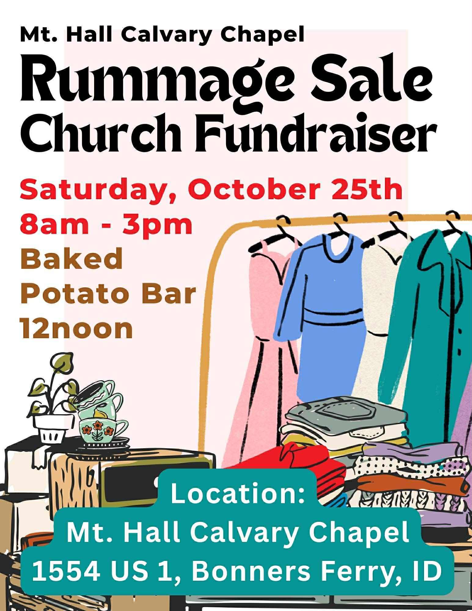 Mt. Hall Calvary Chapel 1554 US1, Bonners Ferry, United StatesMt. Hall Calvary Chapel Rummage Sale Church Fundraiser, 8 a.m. to 3 p.m. Saturday, October 25, Mt. Hall Calvary Chapel, 1554 US1, Bonners Ferry. Baked potato bar at noon!